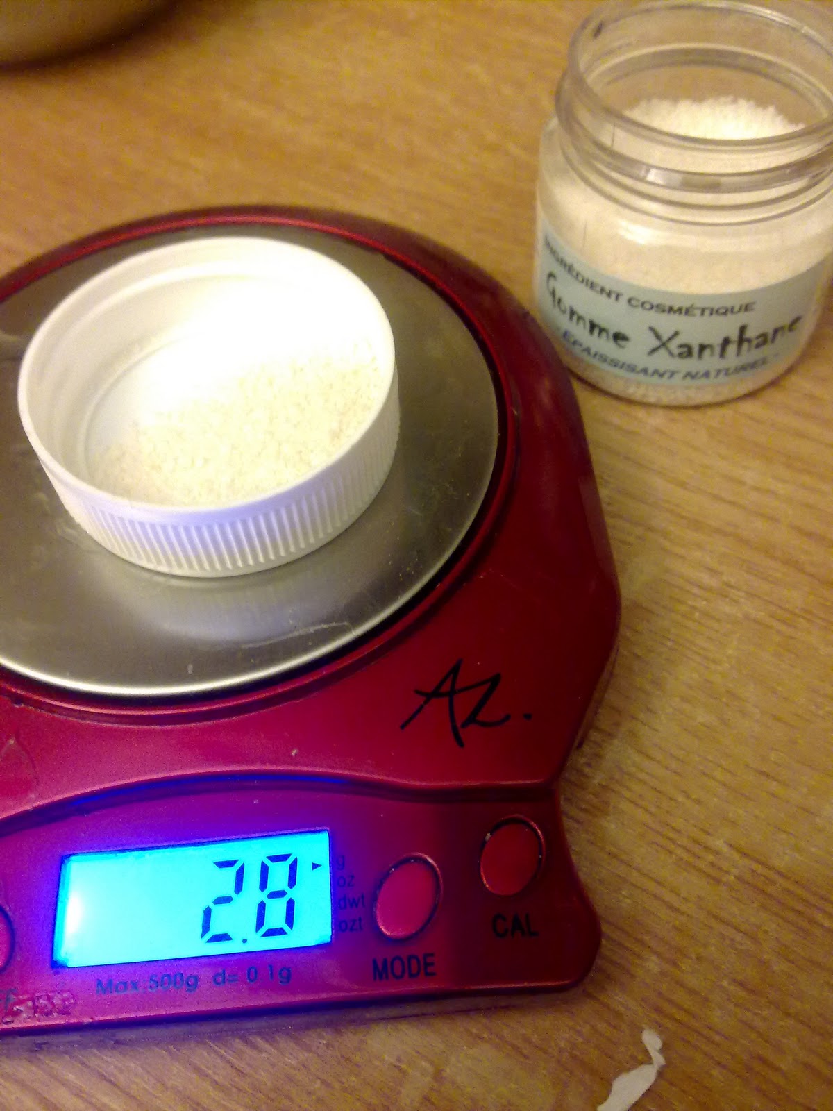 8/ Puis j'ajoute d'un seul coup la quantité dont j'ai besoin de gomme xanthane, préalablement pesée dans un autre récipient, ici le couvercle de la gomme ! (pourquoi faire compliqué quand on peut faire simple ?) Puis bien touiller :D