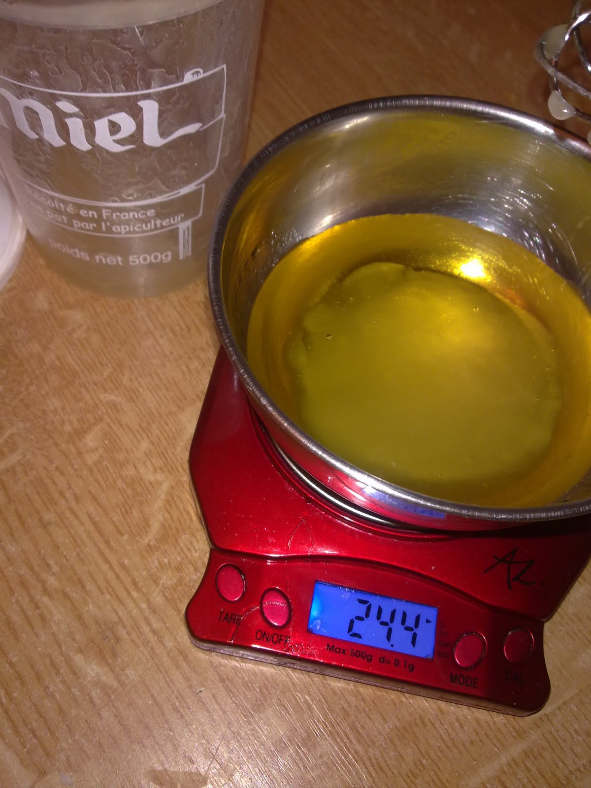 2/ A présent je prélève la quantité de beurre de mangue dont j'ai besoin et je la mets au bain marie pour la faire fondre :