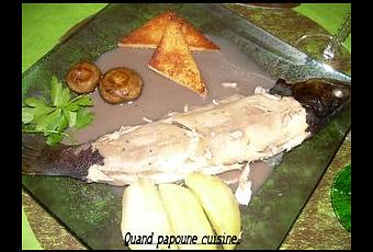 Ingrédients : 4 truites vidées et nettoyées - 1 carotte - 1 feuille de laurier - 1 oignon - 1 morceau de 50g de céleri - 50g de vert de poireaux - 150g de beurre (50+50+50) - persil - thym - 3 cà s de fumet de poisson déshydraté - 50g de farine - 200g de champignons de Paris frais - 4 tranches de pain de mie - 1 bouteille de bourgogne (l'idéal étant du Gevrey-Chambertin) - sel et poivre