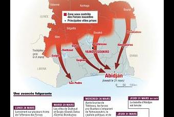 -Carte de l'offensive menée par les FRCI-Malheureusement pour le président, même au sein de ses plus fidèles, l’enthousiasme n’est pas de mise. Le chef d’Etat-major, Mangou, se réfugie même chez l’ambassadeur d’Afrique du Sud. La chute du régime de Laurent Gbagbo semble s’accélérer. Il doit même annuler son message au pays qui avait pour but de galvaniser les patriotes. Les troupes de Laurent Gbagbo ne pouvaient faire face pour plusieurs raisons : le moral des troupes n’était pas maximum, tout comme leur motivation. De même, le recrutement de mercenaires a divisé les troupes de Laurent Gbagbo. Enfin, le paiement des hommes fut plus que difficile. Malgré cette première grosse défaite, Laurent Gbagbo décide de rester au pouvoir coûte que coûte. Des offensives des FRCI ont en effet été repoussées à Abidjan et l’Angola semble soutenir le président en place : tout cela incite certainement le leader du Front Populaire Ivoirien à se maintenir. La France, quant à elle, demande à Laurent Gbagbo de reconnaître la victoire de son adversaire, ce qu’il refuse catégoriquement. Alain Juppé souligne que même le ministre des affaires étrangères Alcide Djédjé aurait alors lâché son président. Il ne resterait plus qu’à négocier sur les conditions de départ, ce qui se ferait déjà selon certains, par l’intermédiaire des «traîtres ». La France, sur place pour défendre ses ressortissants, aurait apporté une aide logistique aux FRCI, par des conseils et formations militaires. De même, par les forces de la Licorne, la France a organisé des opérations militaires aériennes contre la résidence du président Gbagbo. Toutefois, Gbagbo et ses fidèles résistent encore à Abidjan, avec l’aide des soldats de l’Unité de Garde Présidentielle d’Angola. Le chaos qui règne dans la ville favorise en outre les disparitions inquiétantes, qui pourraient constituer des prises d’otages. Afin d’empêcher ces exactions, l’évacuation des expatriés de tous pays s’accélère. Malgré tous ces évènements, la résistance vaillante de Gbagbo semble le renforcer de jour en jour. Aussi se présente t-il comme le résistant patriote face à l’armée d’occupation nordiste soutenue par la France, ancien pays colonisateur. Profitons de cette occasion pour vous montrer la video de la semaine dont voici le lien sur agoravox. Elle montre clairement que contrairement à certaines rumeurs, Laurent Gbagbo, bien que fatigué, est tenace et ne veut pas lâcher sa place. D'ailleurs, selon les dernières nouvelles (source Europe 1), ses fidèles reprennent des quartiers stratégiques d'Abidjan. Les dernières réactions internationales :Selon les Etats-Unis, Ouattara sera à même d’unir le pays qui devrait bientôt être repris à Laurent Gbagbo. A Washington sont également condamnées les exactions à l’égard de l’ONU. Barack Obama soutient les frappes de l’ONU et appelle Laurent Gbagbo à quitter le pouvoir. L’Union Africaine, qui a depuis mars demandé à Laurent Gbagbo de quitter le pouvoir, dénonce également les abus et violations de Droits de l’Homme. Elle appelle à protéger la population civile. Le Sénégal et le Nigéria ont également soutenu les offensives contre Gbagbo. En revanche, à Moscou, on s’offusque d’une ingérence Française dans le conflit ivoirien.Conclusion : La crise Ivoirienne semble tourner en faveur des nordistes menés par Alassane Ouattara, vainqueur officiel des dernières élections présidentiels. Après avoir empêché son rival d’accéder à la présidence, Laurent Gbagbo a refusé toute abdication, affirmant son succès. La solution pacifique ne fut pas longtemps envisagée dans un contexte de reprise du conflit civil qui a décimé la Côte d’Ivoire pendant une décennie. L’offensive de la fin mars 2011 fut fulgurante, contrairement à celle des rebelles de 2002, qui ne disposaient même pas de liaisons radio pour communiquer entre eux. Elle a rapidement eu raison des FDS, qui sont tout de même retranchés à Abidjan avec le peu de soutien dont bénéficie encore le président Laurent Gbagbo. Si l’ONU a joué un rôle ainsi que d’autres organisations inter (ou supra) nationales, on peut également entrevoir une ingérence relative de la France. Plusieurs éléments nous permettent de le dire : d’abord parce que contrairement à 2002, les forces françaises en présence n’ont pas empêché l’offensive des Forces Nouvelles du nord vers le sud, ensuite parce que la Licorne a mené des opérations militaires contre les forces de Laurent Gbagbo (pour se défendre dit-elle), enfin par des conseils et aides apportés conjointement avec les Etats-Unis (selon jeuneafrique.com). La solution politique qui semble se dessiner pourra peut-être permettre à la Côte d’Ivoire, moteur économique de l’Afrique occidentale, de sortir dans la crise économique qui la touche depuis les évènements post-électoraux. Néanmoins, comme le souligne à raison l’africaniste Bernard Lugan sur son blog, la solution devra prendre en compte la situation ethnique et religieuse du pays, deux données ferments des affrontements depuis des années. Il faut surtout insister sur le fait que rien n’est encore complètement joué, même si la situation semble désespérée pour le président Ivoirien, qui s’appuie tout de même sur le mécontentement croissant de certains pays africains comme l’Angola ou l’Afrique du Sud, qui dénoncent l’intervention française. Si Alassane Ouattara vient à devenir président de la Côte d’Ivoire, sa légitimé sera probablement entamée par son installation facilitée par la France. Sources :