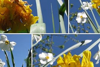 Je voulais montrer le contraste entre une jonquille toute neuve, belle, qui s'élève vers le soleil et une autre, qui est à la fin de sa vie de jonquille et qui penche vers la terre.