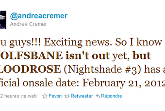 Wolfsbane le deuxième tome de la trilogie Nightshade d'Andrea Cremer n'est pas encore sorti, puisqu'il est prévu en anglais en juillet (et en français à l'automne) que déjà la date de sortie du troisième opus est annoncée. Bloodrose sortira le 21 février 2012 comme l'atteste le tweet d'Andrea Cremer ci-dessous.