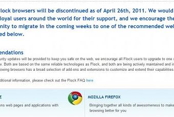 Le navigateur social Flock ferme ses portes à partir du 26 avril ! La maintenance de ce dernier ne sera plus assurée et ses concepteurs recommandent d’utiliser désormais Google Chrome ou Firefox. Lancé en 2005, ce navigateur avait compté jusqu’à 10 millions d’utilisateurs à son sommet. Malheureusement, la concurrence est assez rude avec les mastodontes que sont IE, Firefox et Chrome, pour que Flock arrive réellement à se faire une place. Dommage.