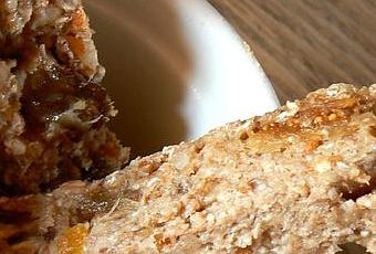 Recette: 1 tasse de flocons d'avoine (j'en ai mis au moins 1 de plus car pâte trop molle) - 1/4 tasse de raisins - 2 poires - 4 figues - 4 dattes - 1/2 tasse d'oléagineux (ici: noix et amandes) - 3 cs de noix de coco - 1 banane - zeste d'un citron - jus d'une orange (à mon avis 1/2 orange suffit) - cannelle + noix de muscade + vanille