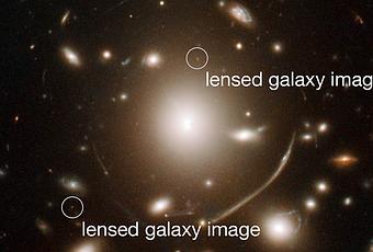La réussite de cette entreprise est en grande partie lié à l’effet de lentille gravitationnel produit par l’amas de galaxies Abell 383. Ce groupe massif de plusieurs dizaines de galaxies déforme l’espace-temps, créant un effet loupe ou lentille (prédit par la relativité générale), très apprécié des astrophysiciens. Une galaxie aussi lointaine apparait habituellement très faible. Dans le cas présent, les astronomes ont pu la distinguer avec une acuité, une résolution 11 fois supérieure ! C’est pour eux une magnifique opportunité d’amplifier le « signal » émis par des galaxies placées aux antipodes de l’amas galactiques (voir le schéma ci-contre) !