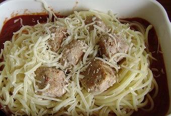 5) Déposer quelques boulettes au centre du "nid" de spaghettis