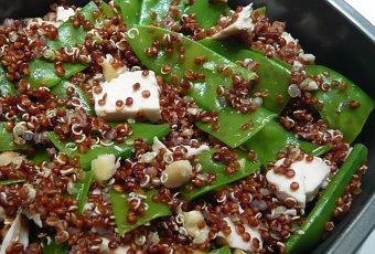 Que mettre dans mon bento ? Sous la main, j'ai du quinoa rouge, des pois gourmands. Je trouve du poulet à leur ajouter, j'ai l'idée d'adjoindre des noisettes concassées pour une texture croquante en plus et voilà. Cuisson, découpe, vinaigrette au soja et ma salade de bento improvisée est prête.