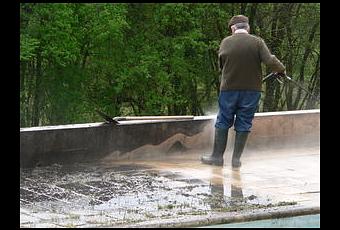 Au fil des années, les abords de la piscine familiale étaient passés du rose style toulousain au gris-noir le plus pollué. Un nettoyage au Kärcher de base n'était pas suffisant. Il fallait y mettre le paquet du côté de l'eau sous pression.