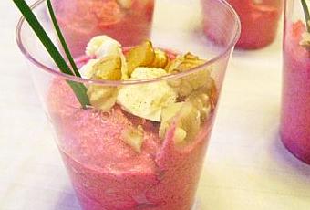 Dans la mesure du possible, éviter de préparer les verrines trop à l’avance car le fromage risque de se teinter de rose.