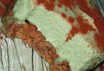 Battre les blancs en neige bien ferme avec une pincée de sel. Battre ensuite la crème en chantilly avec le sucre et la pistache. Incorporer cette préparation aux blancs en mélangeant délicatement.