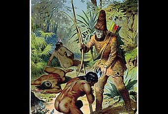 Illustration: Robinson et Vendredi dans le célèbre “Robinson Crusoë” de Daniel Defoë, récit de voyage imaginaire.