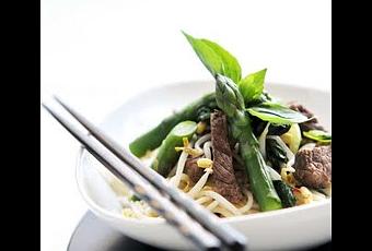 Dans une assiette creuse, déposer des nouilles, puis la viande et les asperges. Napper avec 1-2 càs de jus, quelques feuilles de basilic thaï fraiches et c’est prêt !