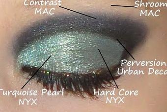 Voilà ce que j'ai utilisé :Primer potion d'Urban DecayPainpot Painterly de MACGel Liner Gold de CS en base colorée sur la paupière mobileUltra Pearl Mania Turquoise Pearl de NYX sur la moitié de la paupière mobilePigment Hard Core de NYX sur l'autre moitiéCrayon khol de Essence pour dessiner la bananeContrast de MAC pour la bananePerversion du BOS III d'Urban Decay pour accentuer la "démarcation" et sur le ras de cil inférieurShroom de MAC pour la touche lumièreDeep Truth de MAC sur le ras de cil inférieur (par dessus Perversion)Eyeliner Gel brun de EssenceGlitter liner Gold de NYX par dessus l'eyeliner brunAqua Eyes de MUFE sur la muqueuseAqua Smocky Lash de MUFE