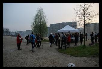 Au fil du trajet, quelques groupes, bâtons en bandoulière, montent dans le Tram. Nous arrivons sur l'Ile de Monsieur vers 8h00. A notre surprise, il y a déjà beaucoup de monde. Nous retrouvons nos camarades de marche du WE. Une fois le dossard récupéré et attachéavec astuce pour ne pas trouer les vêtements étanches, nous commençons les échauffements, tous ensemble.