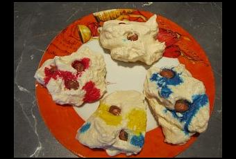 Montez les blancs en neige. Aux 2/3, incorporer le sucre. Sur une plaque recouverte de papier sulfurisé, déposer des petits « tas » de meringue dans lesquels vous déposerez 2 ou 3 noisettes entières. Laisser tomber une goutte de colorant alimentaire sur les meringues.