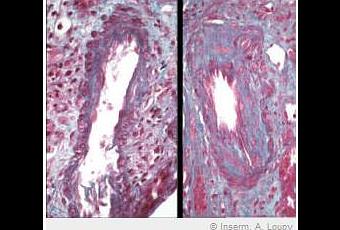 Source: Communiqué Inserm, The Journal of the American Society Nephrology,14 avril 2011 doi: 10.1681/ASN.2010070777 “Donor-Specific Antibodies Accelerate Arteriosclerosis after Kidney Transplantation” (Visuel Inserm “Progression de l'artériosclérose dans la première année de greffe, démontrant un rétrécissement significatif du calibre de l'artère et de sa lumière entre 3 mois de greffe (Gauche) et 1 an de greffe (Droite)”).