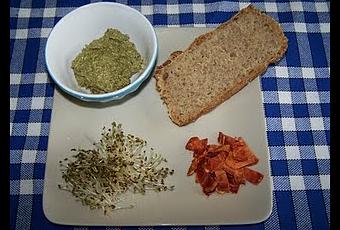 J'ai mixé : 4 à 5 cuillères à soupe de germes de lentilles corail bios, 1 cuillère à soupe de graines de lin brun bios moulues (au moulin à café), 10 grandes feuilles de navet (de mon jardin) dont j'ai retiré les parties dures, 1 cuillère à café de Tahin bio (purée de sésame), une cuillère à café de sarriette déshydratée bio, 2 pincées d'ail déshydraté, 10 feuilles d'origan de mon jardin, 4 olives noires bios dénoyautées, 1 pincée de sel bio, 1 cuillère à soupe d'huile d'olive bio et 3 cuillères à soupe d'eau.J'ai bien mixé le tout. J'ai servi avec des germes d'alfalfa maison, des petits morceaux de tomates séchées maison, du pain complet maison (dont j'ai fait la seconde pousse dans un cercle à pâtisserie pour pouvoir faire de plus grandes tranches).