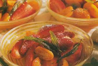 Ingrédients pour 6 personnes : 300 g de kumquats, 500g de fraise Mara des Bois, 120 g de sucre, 10 feuilles de verveine fraîches ou séchées, poivre blanc en moulin.