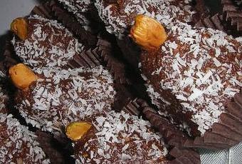 façonner a votre convenance en boules ,en pyramide ou autres enrouler dans la noix de coco ,décorer avec l'amande ou autres ,mettre dans des caissettes et consommer .
