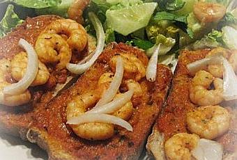 Faire griller les tartines au grille pain, étaler la sauce tomate, puis poser les crevettes, et l'oignon émincé
