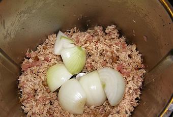 ajoutez les lardons et les oignons 2 coups de turbo , ajoutez les reste des ingrédients de la farce uniquement et mixez à nouveau 3 coups de turbo.