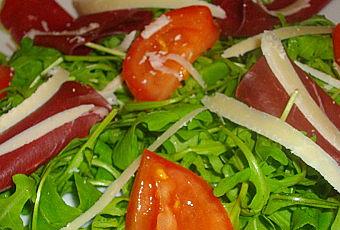 En ce moment dans certaines régions, il fait bien chaud, je vous propose donc une salade à l'accent italien avec de la bresaola, qui est une viande de boeuf séchée et du parmesan frais coupé en lanières. Très rapide à préparer comme nous l'indique son créatrice Rosa Jackson.