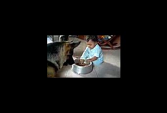 Bébé veut manger dans la gamelle du chien, mais le chien ne se laisse pas faire