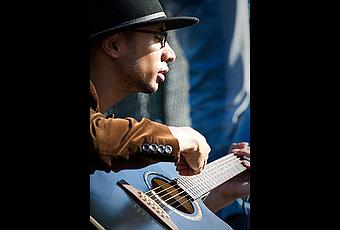 Le Pont Des Arts à Paris, sous le soleil, une aubaine pour un photographe. Ce pont regorge d'artistes de toute sortes et de passants en tous genres. Des expressions, des regards, des attitudes, tout est là. Ici un homme en train de jouer de la guitare en plein soleil. Passionné par ses cordes et ses chants je n'ai pas mis longtemps avant d'immortaliser l'expression de son visage et son instrument.