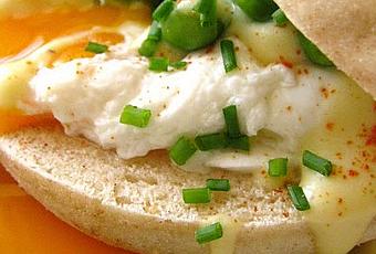 Couper les muffins en deux et disposer une moitié sur chaque assiette. Poser un oeuf sur chaque muffin, répartir la sauce au beurre et les petits pois. Parsemer le paprika et la ciboulette ciselée. Recouvrir avec les moitiés de muffin restant et servir de suite.