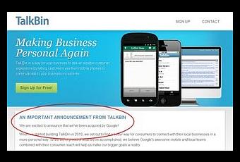 When we started building TalkBin in 2010, we set out to find a better way for consumers to connect with their local businesses in a more personal way. While we’re proud of what we’ve accomplished, we believe Google’s awesome mobile and local teams combined with their consumer reach will help us make our bigger goals a reality.We appreciate all the support and positive feedback we received from all of our partners and we’re elated to join Google and get started!