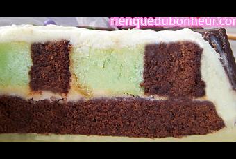 Verser dans un moule à manqué en silicone d'abord la pâte chocolat, puis la pâte à la menthe, et faire cuire jusqu’à ce qu’une lame plongée à cœur ressorte humide mais propre.