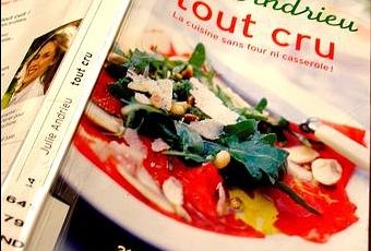 Les salades, c'est pas trop mon truc, surtout au resto... c'est un peu comme les pâtes, j'ai l'impression de perdre mon argent en me disant que je peux les faire chez moi... Pas comme les pizzas, qui demande du professionnalisme, de la technicité ou des outils appropriés... bref une recette de salade, pas trop courant par ici. Mais elle vient du livre dont j'avais déjà testé la salade de panais aux cranberries... le Tout Cru de Julie Andrieux. Un livre qui va me faire aimer les salades...