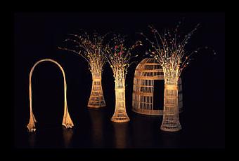 Un orgue de barbarie joue au coin du jardin, l’image à peine perceptible d’un loup apparaît, traverse la scène puis disparaît, comme un souvenir, une peur, un désir… Et une voix mâle nous parle d’elle, la petite fille très belle, « la plus jolie qu’on eût su voir »… Ces quelques mots entre guillemets sont du conte de Perrault. La compagnie des Globe trottoirs va broder tout autour. Non, broder n’est pas le mot juste : la compagnie va tresser des images, et, pour commencer, ce décor fait de vanneries évoquant arbres et cabane. La mère fort occupée au ménage, aux semailles et aux poules, la fillette enjouée, naïve et obéissante, le loup qui fait son métier de loup (faire peur aux gens) et trame son projet de séduction, la mère-grand si grande… et aucun ne prononce de mot. Tout est joué sur le mode du cinéma muet, allant jusqu’au burlesque, et entrecroisant des gestes, ceux de l’enfant dans les jupes de sa mère et ceux de la grand-mère dévorée par le loup, par exemple ; le tango où s’affrontent la mère et le loup devient un peu plus tard une valse que dansent le loup et la fillette… Bizarrement, la couleur dominante n’est pas le rouge (de la fillette) qui serait opposé au noir (du loup). Les femmes sont vêtues de bleu et le loup ressemble à un chasseur… On connaît l’histoire et la compagnie nous en fait découvrir d’autres possibilités.