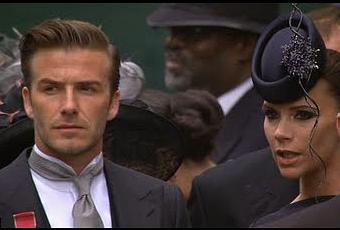 Nous avons notamment pu apercevoir Victoria Beckham alias Posh accompagné de son footballeur de mari David. Elle porte une tenue ample pour cacher sa grossesse gracieusement. Elle a créé cette robe noire elle même. Elle a choisi un petit bibi comme chapeau et enfin des escarpins customisés Christian Louboutin vertigineux ...