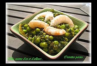 Pour 4 personnes, il vous faut: 24 crevettes cuites 1 citron 3 tomates 400 gr d'épinards (surgelés pour moi) 400 gr de petits pois (surgelés pour moi) 2 oignons 2 gousses d'ail Coriandre 1 cuillère à café de curcuma Un petit morceau de gincgembre (2 cm) 1 cuillère à café de piment doux en poudre 2 cuillères à soupe d'huile végétale 1 cuillère à soupe d'huile de sésame sel, poivre