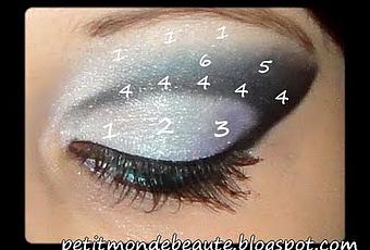 Ce que j'ai utilisé : Primer Potion d'Urban DecayGel liner Silk White de Coastal Scents en base colorée sur toute la paupière(1) Mélange de pigments blancs Coastal Scents en coin interne et en touche lumière(2) Hot Pot S04 (bleu clair) de Coastal Scents au milieu de la paupière mobile(3) Hot Pot S08 (mauve clair) de Coastal Scents en coin externe et sur les 2/3 du ras de cil inférieur(4) Perversion d'Urban Decay sur le bord externe, pour marquer la banane et sur le reste du ras de cil inférieur(5) Plumage de MAC pour estomper Perversion vers l'intérieur de la paupière(6) Hot Pot S12 (bleu azur) de Coastal Scents pour estomper Plumage vers et la bananeGel liner Midnight in Paris de Essence