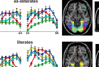 Ils ont mesuré, par IRM fonctionnelle l’activité cérébrale d’adultes volontaires diversement alphabétisés devant des situations de lecture. Les résultats démontrent que la lecture influence fortement le développement du cerveau : apprendre à lire augmente les réponses des aires visuelles du cortex ; la lecture augmente les réponses au langage parlé dans le cortex auditif ; et la lecture induit une extension des aires du langage et une communication bidirectionnelle entre les réseaux du langage parlé et écrit : chez un bon lecteur, voir une phrase écrite active l’ensemble des aires du langage parlé, et inversement. Enfin les modifications cérébrales liées à l’alphabétisation peuvent se produire à l’âge adulte, les circuits de lecture demeurant plastiques tout au long de la vie.