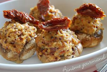 Je cuisine souvent les champignons en accompagnement mais assez peu en plat principal, non pas parce que nous n'aimons pas mais tout simplement parce que je n'y pense pas. Et pourtant c'est très bon. La semaine dernière en faisant mes courses, j'ai remarqué de beaux et gros champignons à farcir et je me suis souvenue d'une recette trouvée dans le magazine "Maxi cuisine" que j'avais faite il y a longtemps et qui nous avait bien plu. Donc voilà un plat refait et à nouveau apprécié. Pour obtenir un plat plus complet, on peut doubler la quantité de boulghour et en servir la moitié en accompagnement avec une noix de beurre et de la salade comme le suggère le magazine. Ce plat m'a donné envie de tester d'autres recettes de champignons farcis. C'est simple, c'est bon et ça change un peu.