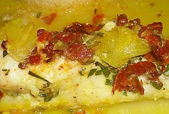 Déposez le dans un plat, salez et éparpillez dessus les tomates hachées et 2 citrons confits coupés en lamelles épaisses. Arrosez avec l'huile citronnée et le fumet de poisson et le noilly prat enfournez 35m et servir.