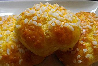 Préchauffez le four à 180°C (thermostat 6). Dans un bol, cassez l'oeuf et battez le en omelette, à l'aide d'un pinceau badigeonnez les boules de jaunes d'oeufs. Décorez le dessus des brioches de sucre en grains.
