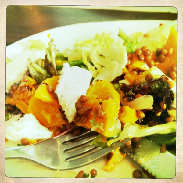5. Assemblez votre salade sur une grande assiette: d'abord les pousses de salade, la menthe, un peu de sauce. Tournez la salade puis saupoudrez de lentilles avant de poser delicatement les tranches de courge, le fromage de chevre coupé en des et un trait de sauce de salade en dessus pour finir.