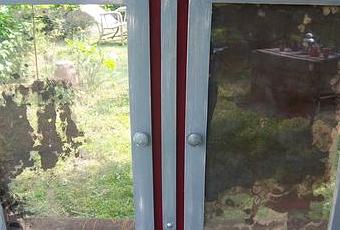 Fond qui avait pris l’eau, portes coincées, glaces en miettes, tiroir coincé, le tout recouverts de 4 couches de peinture à l’huile coquille d’œuf !!!!!!!!!!!!!!!!!