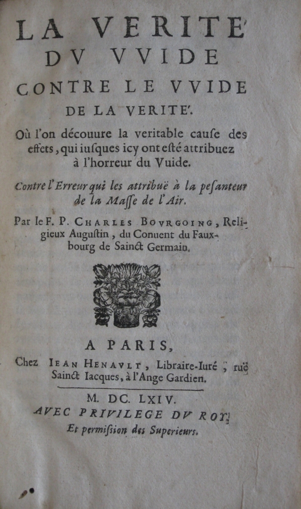 Le titre complet de cet ouvrage est: La vérité du vuide contre le vuide de la vérité. Où l’on découvre la véritable cause des effets qui jusques icy ont esté attribuez à l’horreur du vuide. Contre l’erreur qui les attribue à la pesanteur de la masse de l’air . L’auteur critique l’ouvrage de Pascal ; il ne croit pas en la pesanteur de l’air et explique les effets qu’on lui attribue à sa « raréfaction »