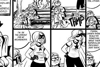 This one is dumb. I was still trying to figure out where I wanted to go with the strip, and this is more in the direction of « clueless superhero does clueless stuff. » Ugh. Usually I show my boyfriend my comics and if he giggles, I know it’s a good comic. He didn’t like this one, and I agree. The character doesn’t even look right… her hair is all grown up and coiffed. Anyway… on to the next strip: