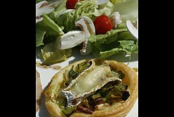 3. Arroser la salade de vinaigrette à la rhubarbe, ajouter quelques fines lamelles de chamoignons et tomates cerises. Disposer la tartelette et servir aussitôt.