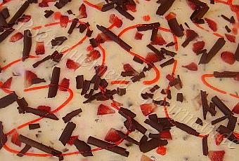 Décorez avec des dés de fraises , quelques copeaux de chocolat et des fils de gel coloré.