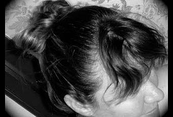 1- Coiffer vos cheveux en une queue de cheval très haute sur le dessus de la tête, avec le dernier tour d'élastique faites une sorte de boule comme pour un chignon et laisser les cheveux de la queue tomber sur le devant de la tête comme sur le schéma.