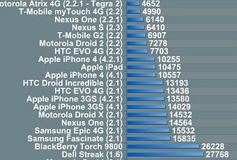 Nous le savions déjà, l’iOS 4.3.1 est bien plus rapide que son ancêtre, le 4.2.1. Pour prouver cela, voici un test sur Safari montrant les différences : il fallait un peu plus de 10 000 ms pour mener à bien ce test sous l’iOS 4.2.1, maintenant avec l’iOS 4.3.1 le test donne comme résultat : 4114 ms !!! Plus que 2 x plus rapide !