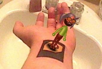 On savait que la Réalité Augmentée de la 3DS fonctionnait très bien avec des cartes artisanales des versions officielles mais aussi avec des reproductions sur un smartphone (photo ou application). Et bien sachez que ça marche aussi avec les tatouages ^^