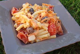 Mélanger des pâtes froides, des tomates cerises, des carottes râpées, des ails au vinaigre, des olives, du surimi et de la mayonnaise allégée.
